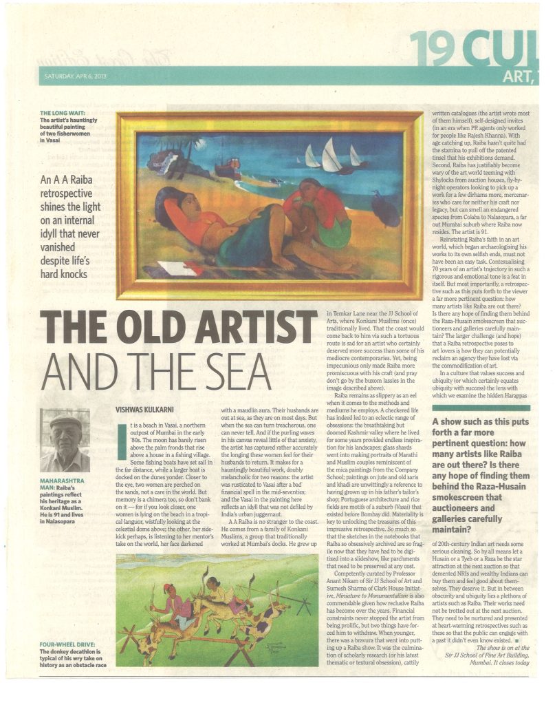 A A Raiba is no stranger to the coast. He comes from a family of Konkani Muslims, a tribe that traditionally worked at Mumbai’s docks and the artist grew up in Temkar Lane near the JJ School of Arts, where Konkani Muslims (once) traditionally lived. That the coast would come back to him via such a tortuous route is sad for an artist who certainly deserved more success than some of his mediocre contemporaries. Yet, being impecunious only made Raiba more promiscuous with his craft (and pray don’t go by the buxom lassies in the image described above). Raiba remains as slippery as an eel when it comes to the methods and mediums he employs. A chequered life has indeed led to an eclectic range of obsessions: the breathtakingly doomed Kashmir valley, where he lived for some years, provided immeasurable inspiration for his landscapes; glass shards went into making portraits of Marathi and Muslim couples reminiscent of the mica paintings from the Company School; paintings on jute and old saris and khadi are unwittingly a reference to having grown up in father’s tailor’s shop; Portuguese architecture and rice fields are a motif for a suburb (Vasai) that existed before Bombay did. Materiality is key to unlocking the treasures of this impressive retrospective. So much so that the sketches in the notebooks that Raiba so obsessively archived are so fragile now that they have had to be digitized into a slideshow, like parchments that need to be preserved at any cost.